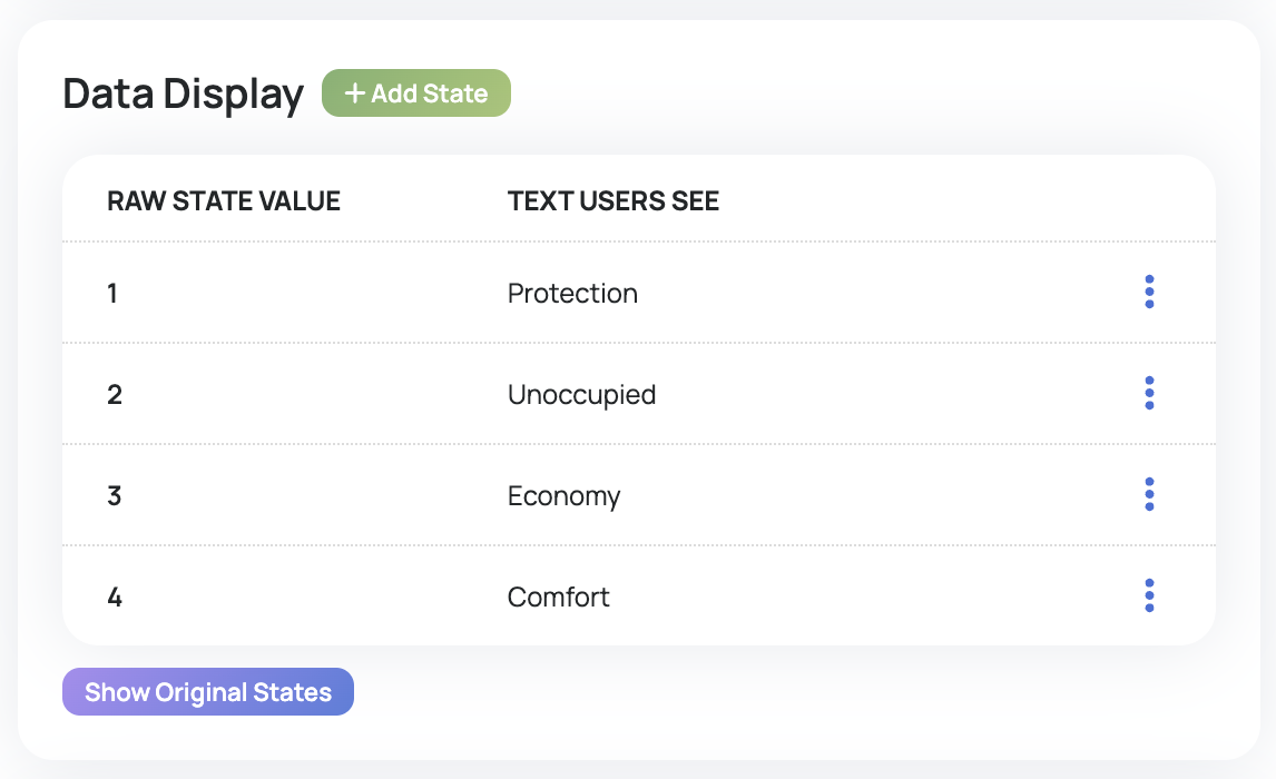 While the Motion tile will present user-friendly verbiage for each state, the underlying raw value is always an integer (i.e. a number with no decimal point). So while the user may see "Unoccupied" on the tile, the actual value being send and received in the background that represents cooling mode will be a number, such as 2. The tile configuration is where the installer manages these value mappings: